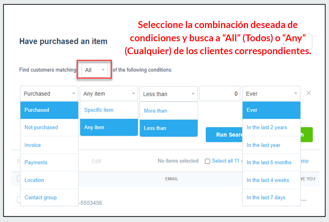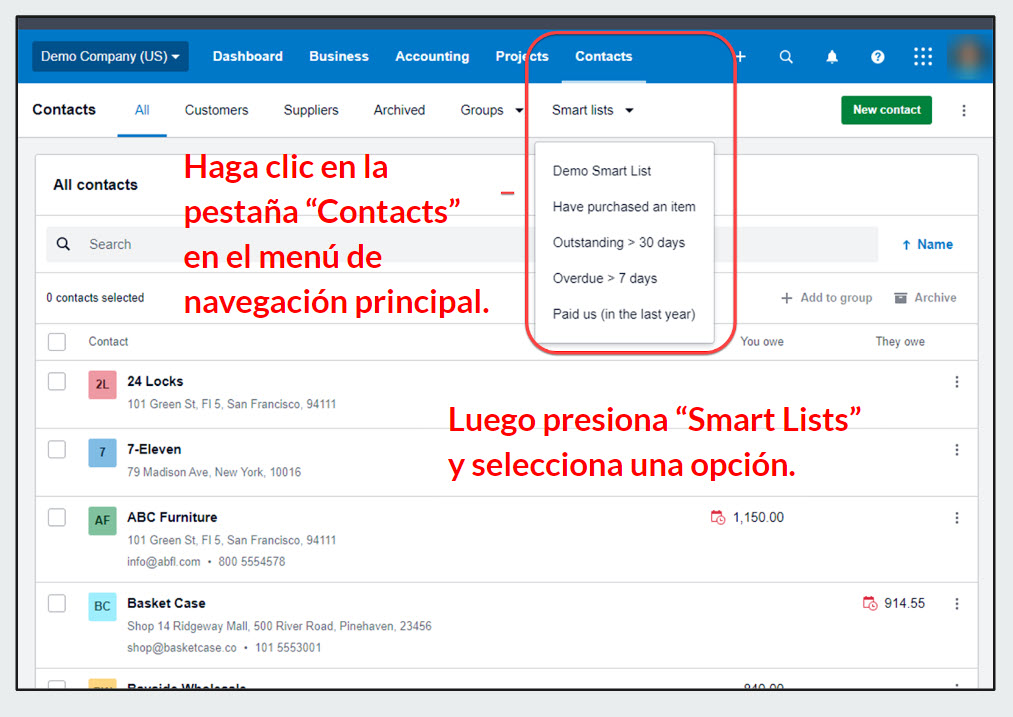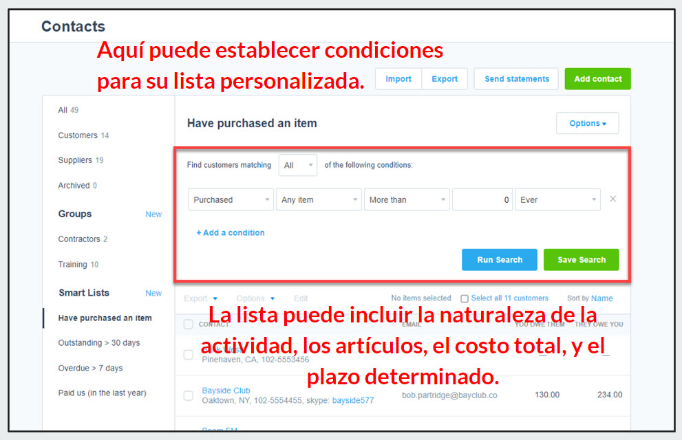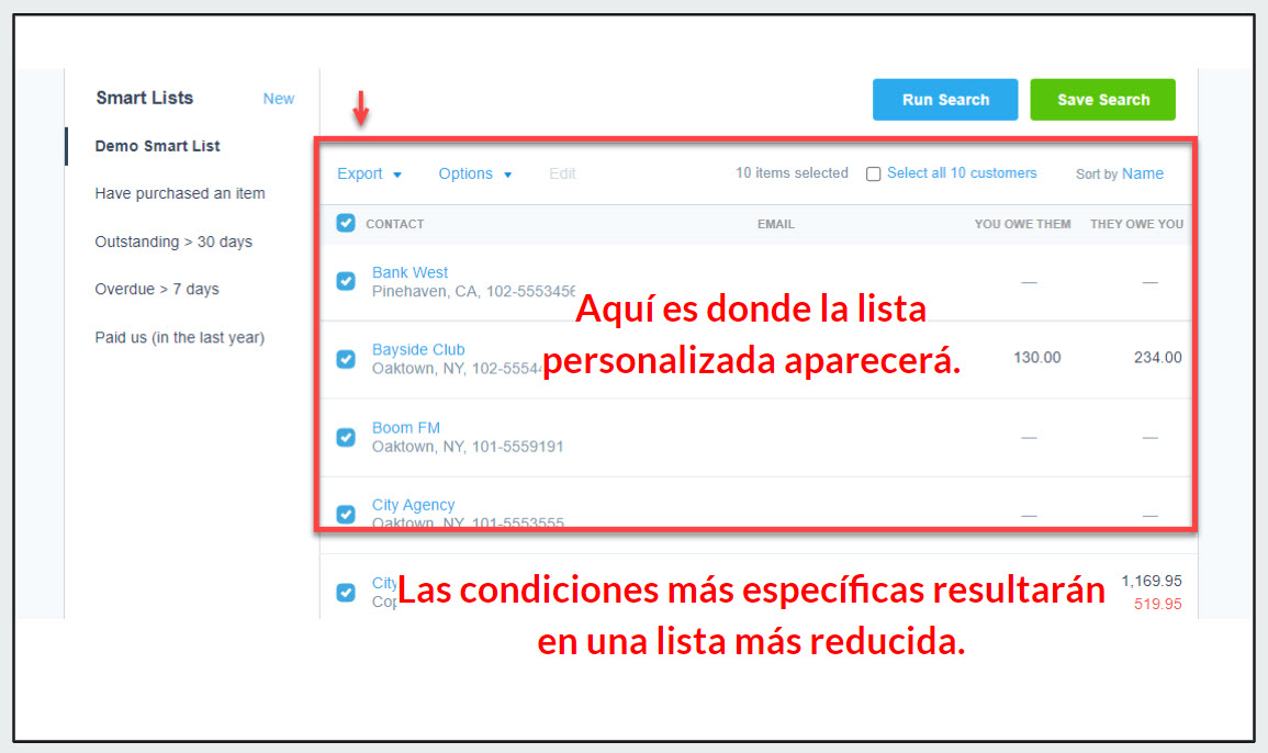 Las Listas Inteligentes, llamadas en Inglés “Smart Lists,” utilizan parámetros preestablecidos para crear grupos personalizados. Puede crear listas basadas en artículos comprados, clientes con facturas pendientes o vencidas por fecha de vencimiento, cuándo se recibió el último pago o la ubicación del cliente. Puede usar múltiples condiciones, e incluso incluir grupos de contactos específicos, haciéndolo fácil de crear esa lista de marketing perfecta o envío masivo de correos electrónicos.