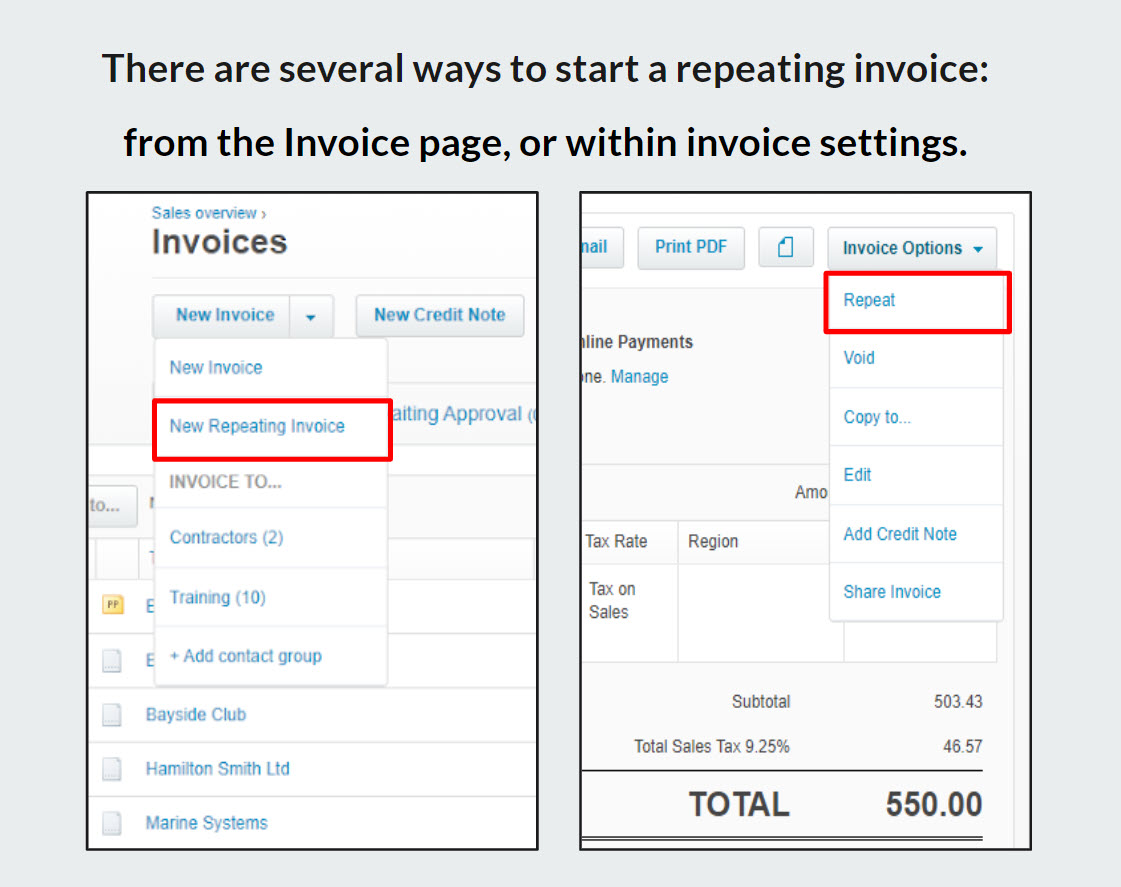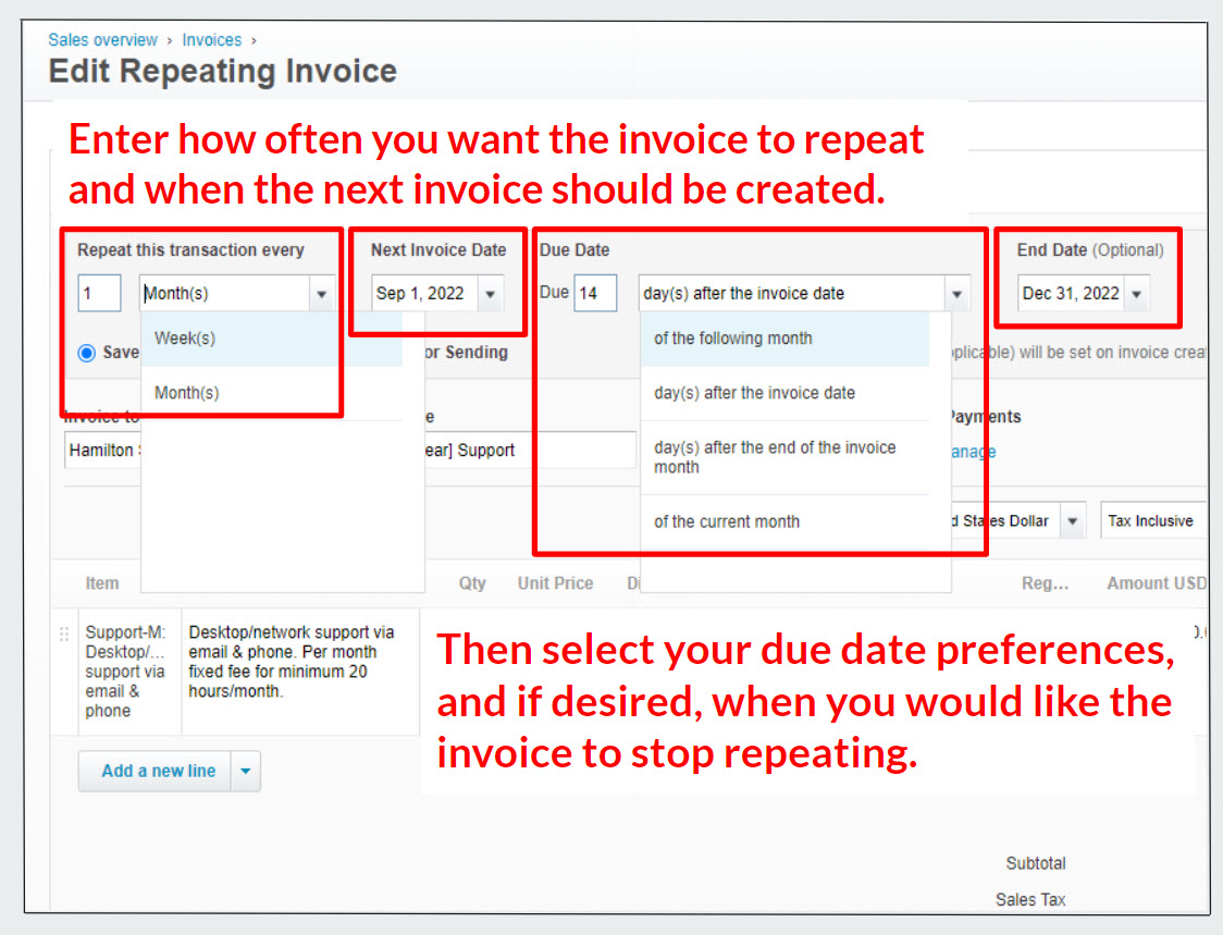 If you need to invoice the same customer on a regular basis, consider using the “Repeating invoice” feature. It works especially well for fixed price contracts since it automatically creates the invoice on a predetermined schedule. You can preset line items and amounts, increasing the consistency of your invoicing.